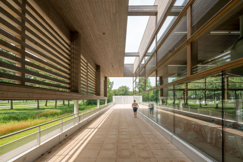 The former ‘Steur’ site is transformed into a large green open space in the park, where the swimming pool, like a villa, will overlook its surroundings. The swimming pool forms a pavilion within the park, integrating the green space and pool into one.