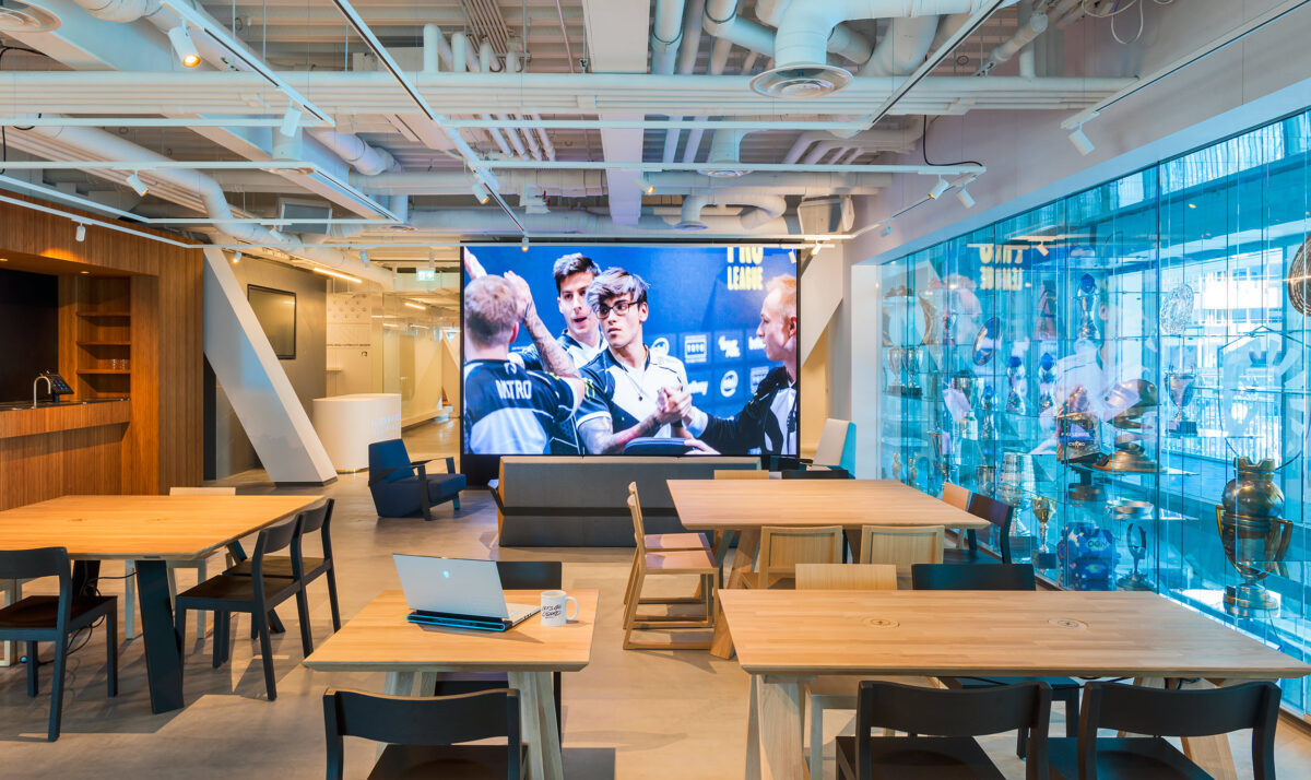 The public zone on the ground floor is separated from the players and office staff by an impressive, 3 meters high, transparent trophy case that offers a glimpse of the world behind. The first floor provides room for the state-of-the-art training facility. Next to the scrim rooms, where the athletes train, there is a restaurant that will sustain the players while they prepare for tournaments. The Team Liquid European staff, housed in a transparent and roomy office, are provided with a setting that will surely elevate their operation, and brand, across the world of esports.