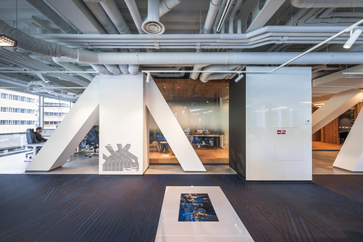 The imaginative use of the interior’s materials also creates an interplay between the real and the imagined, with a daring choice of colours and materials accentuating different spaces and functions. Atmospheres skilfully alternate from chic and dynamic to professional and focused to reflect the function of the space. Black, white, bamboo, blue manes and hexagons are forged into a bold, yet sturdy, mise en scene; while the brand’s identity is represented both explicitly and within hidden easter eggs. By using bio-based and recycled materials, efficient installations, smart acoustics, lighting, and prefab elements, we have created a sustainable, healthy and comfortable workspace for Team Liquid.