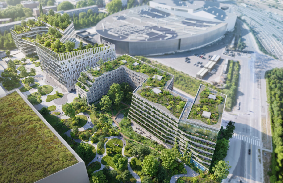 The various programs are united by our coherent and subtle architectural language, in continuity with the major landmark of Euralille while introducing a human scale. In dialogue with the neighboring building “Biotope”, our architecture adopts a simple, structured mineral façade that leaves room for nature. The building’s compactness opens up ground for greenery and central breathing space. Through its ingenious S-shaped form, it protects itself from infrastructure noise by creating an intimate square at its centre while opening generously a garden towards the inner block.