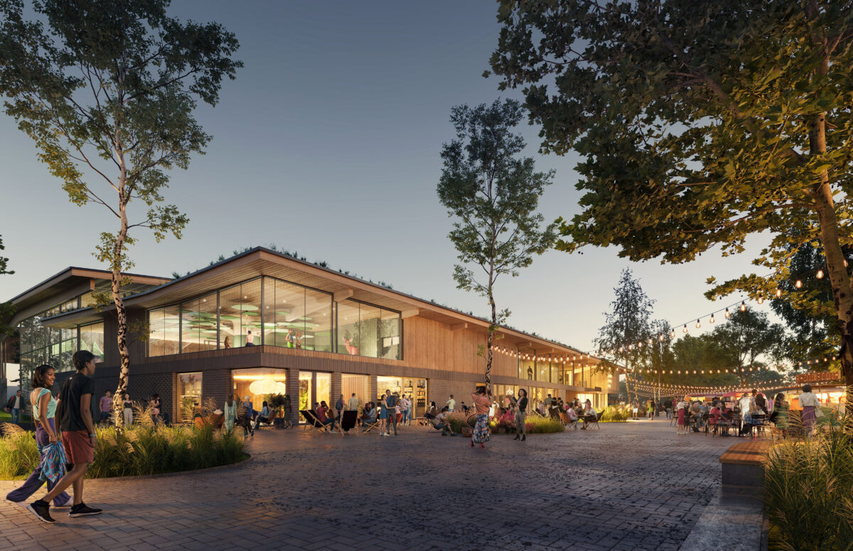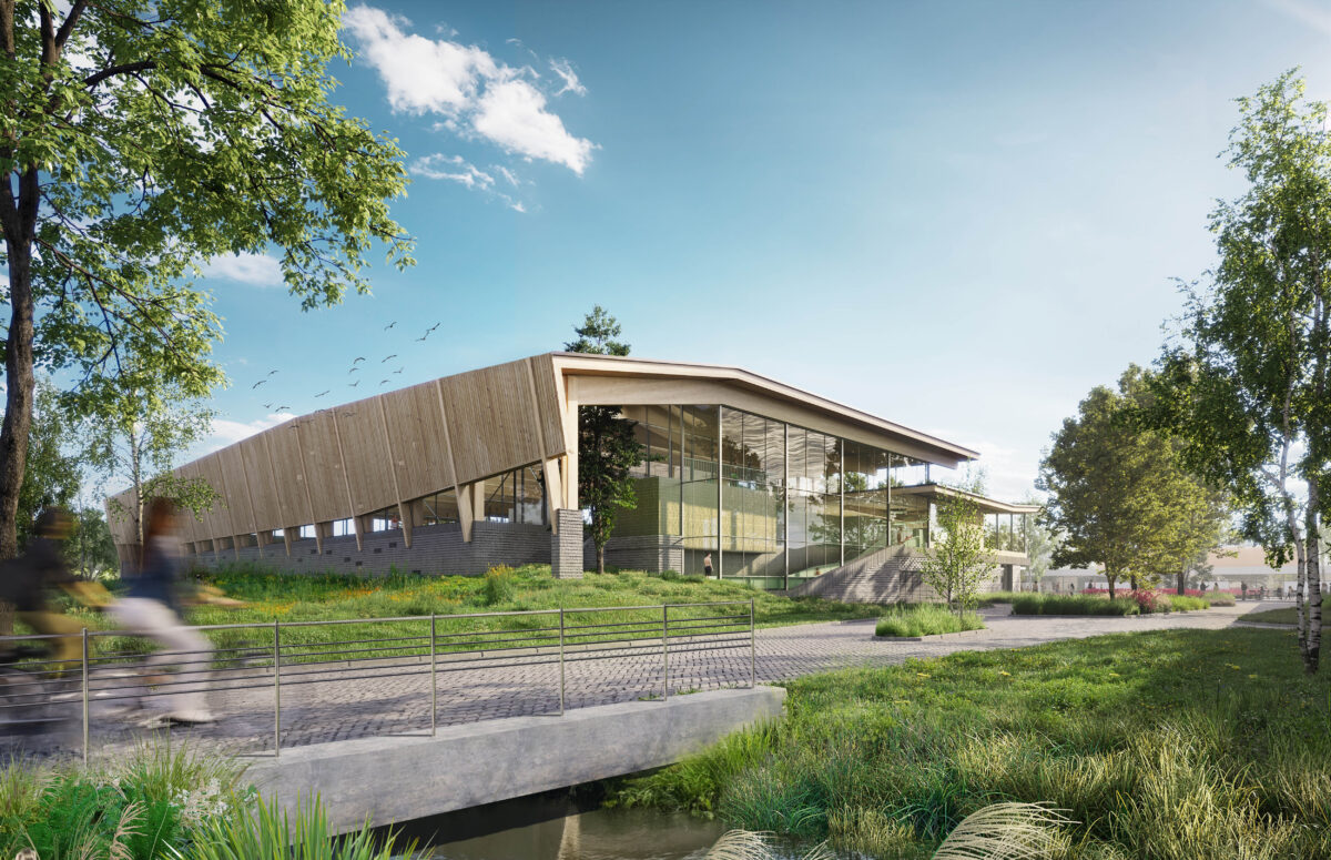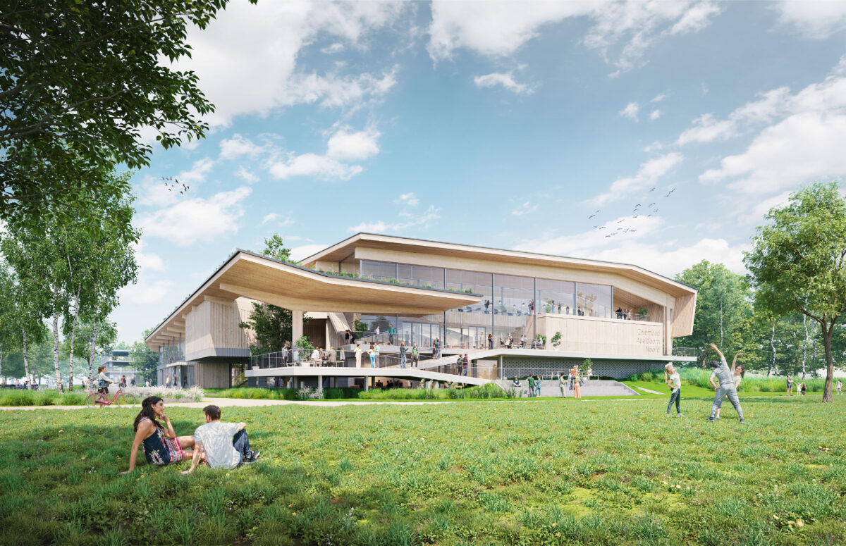 The goals for sustainability within the municipality of Apeldoorn are translated to a natural and circular design. Inspired by the beauty of Hoge Veluwe and the local theme “Green and Grand,” the architectural design reflects these ambitions. Featuring angled roofs and terraced forms, the striking wooden structure highlights the architectural identity. Circular materials take center stage: reused paving stones collected from the neighborhood serve as bricks, and the prominent use of wood brings the warmth of nature indoors.