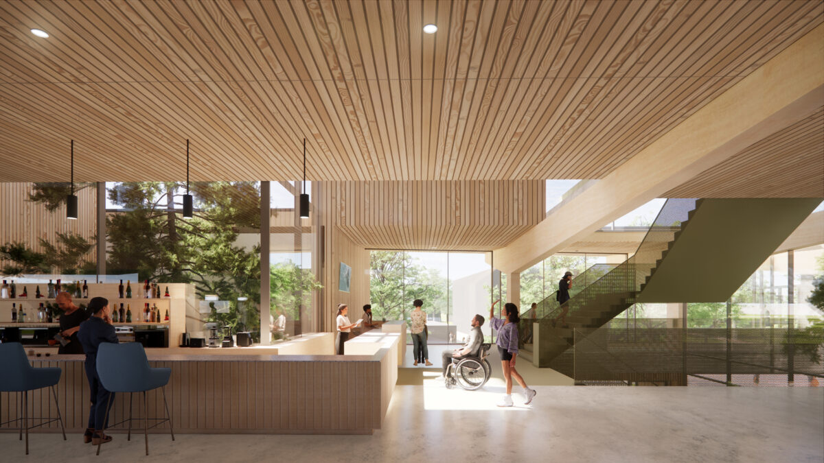 With a lively ground floor and welcoming design, the building invites interaction between visitors and the surrounding community. Patios and stepped terraces create a natural transition between the park-like environment and the complex, connecting indoor and outdoor spaces effortlessly.