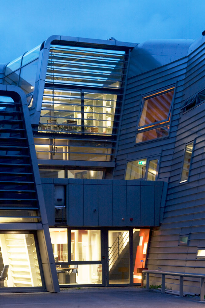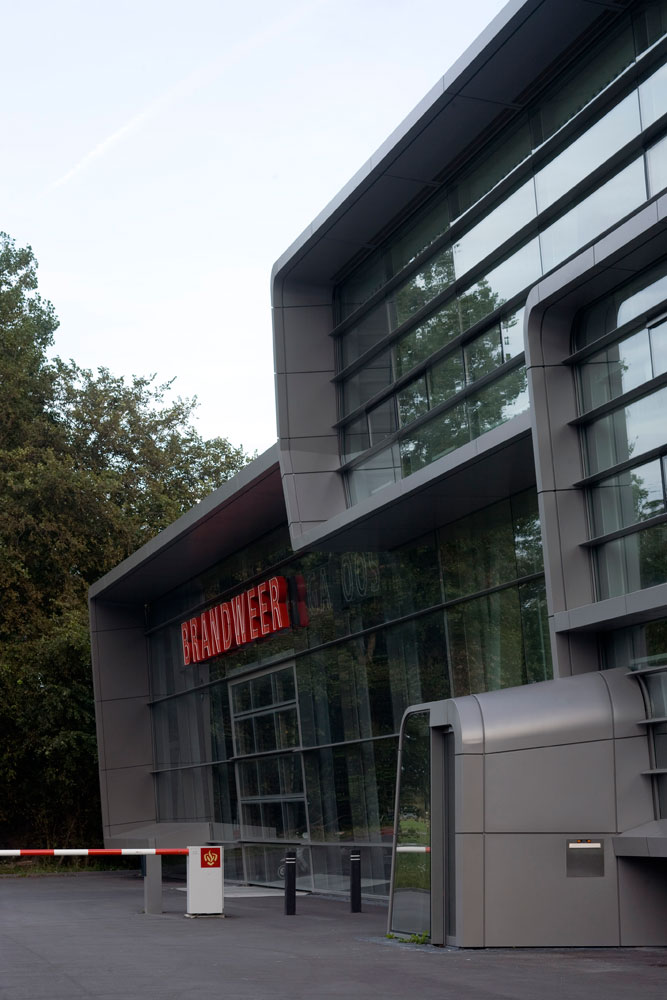 The entrance hall, separated from the fire engines by only a large glass wall, is at the heart of the building, so visitors feel surrounded by fire engines from the moment they walk in. This hall is connected to a three-storey atrium. Like a village square, all the functions of the building visibly line this space: the offices, garage, gym and living quarters can all be seen.