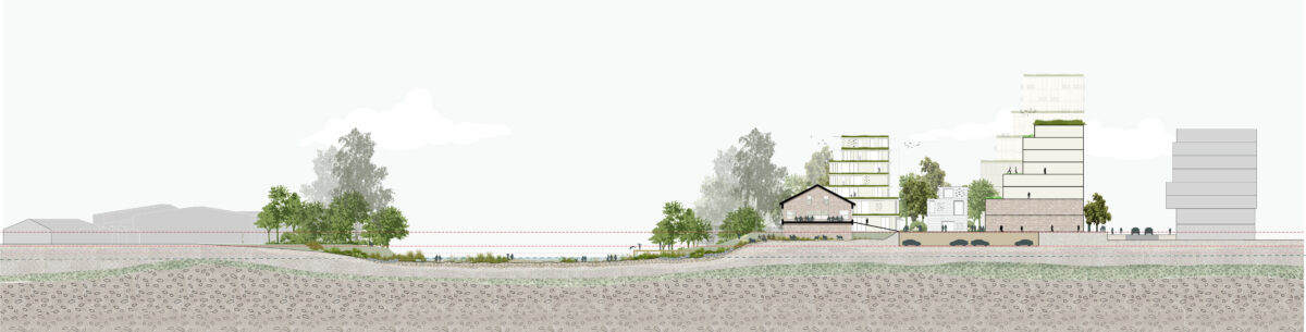 On Libeň Island we drew up a building development that increases the quality of life of all living beings in the Vltava valley. We designed the new buildings to be nature-inclusive, part of the larger ecological functioning in the area. Here, the high-quality public space design was inspired by flood prevention, it prioritizes pedestrians and celebrates communal gardening. At the river’s edge we proposed the Corso: a long, paved dike lined with trees, serving as a seating, and strolling edge to the city.