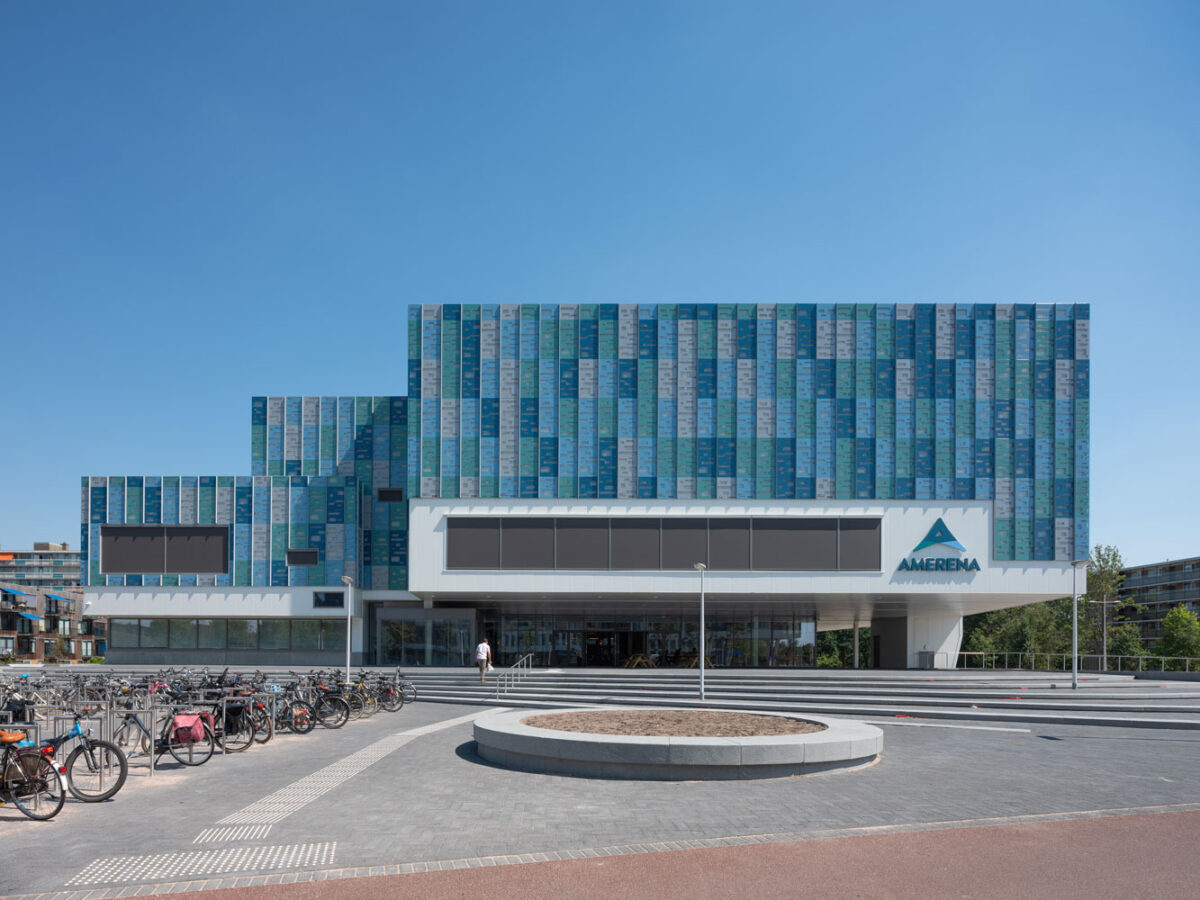 The new Amerena sports complex offers an extensive sports program of 10,500 m2. With its striking color and nighttime illuminated trim, the building is an eyecatcher from the entry of Amersfoort. From all sides the different functions in the building are recognizable by its distinctive façade openings. On the Buurtas the building is open and inviting with the entrance and terraces. To the side of Waterwingebied and Spreeuwenstraat the building has a landscaped appearance with roof terraces and a green roof.