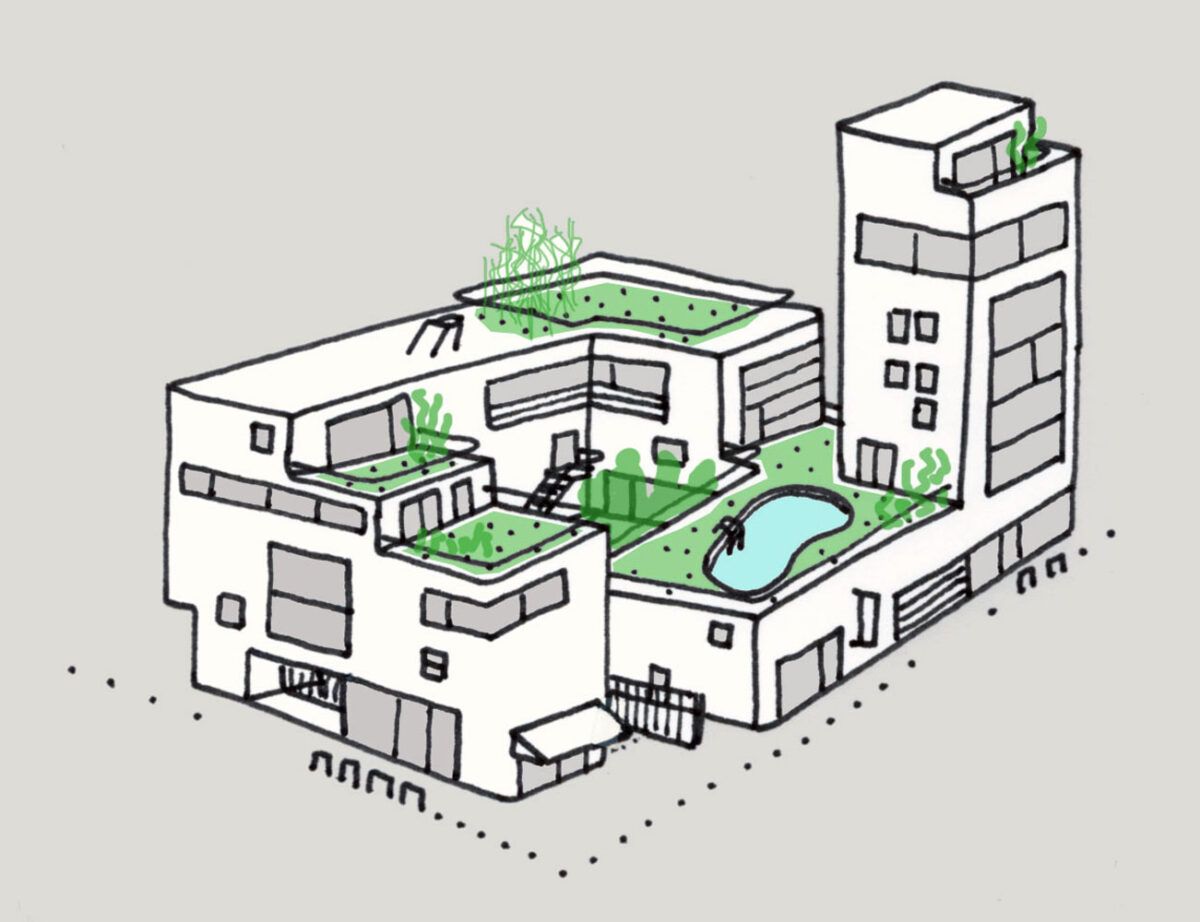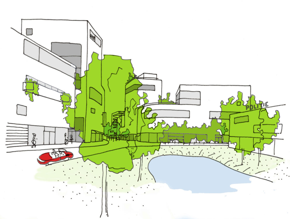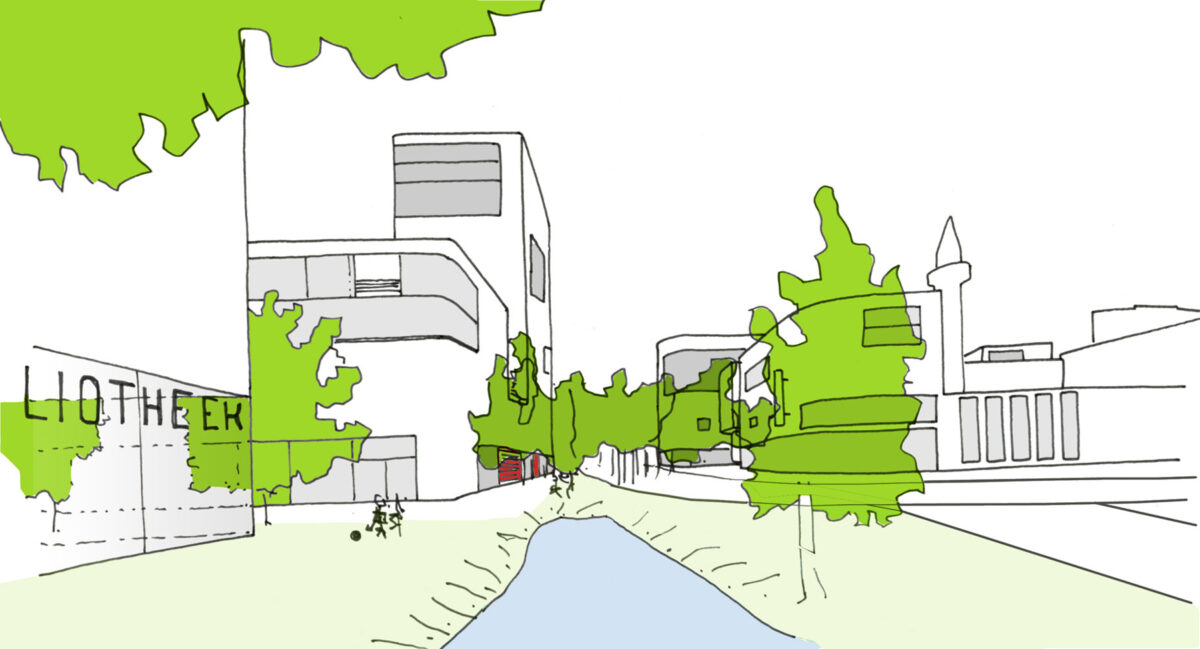The Kooiplein Centre Plan is a plan for a new city centre with high-density buildings around and on an area converting the Willem de Zwijgerlaan into an underpass. The plan will reduce inconvenience from through traffic and restore the slow-traffic connection between the north and south parts of Leiden. A combination of shops, businesses, studios, cafés and restaurants, public facilities and healthcare facilities, a mosque and a community school make this area a multicultural ‘heart of Leiden North’. In the new situation, the new facilities, parks and athletic fields that were once difficult to access will be incorporated into the neighbourhood in a natural way. The building blocks of the new centre are hybrid blocks combining all sorts of combinations of homes, shops, facilities and work. Collective spaces, roof terraces and enclosed gardens are important components in the blocks. This is what guarantees good living quality even in high-density areas. The spaces between the blocks of buildings are car-free thanks to a ‘maxi-roundabout’ that routes traffic around the centre.