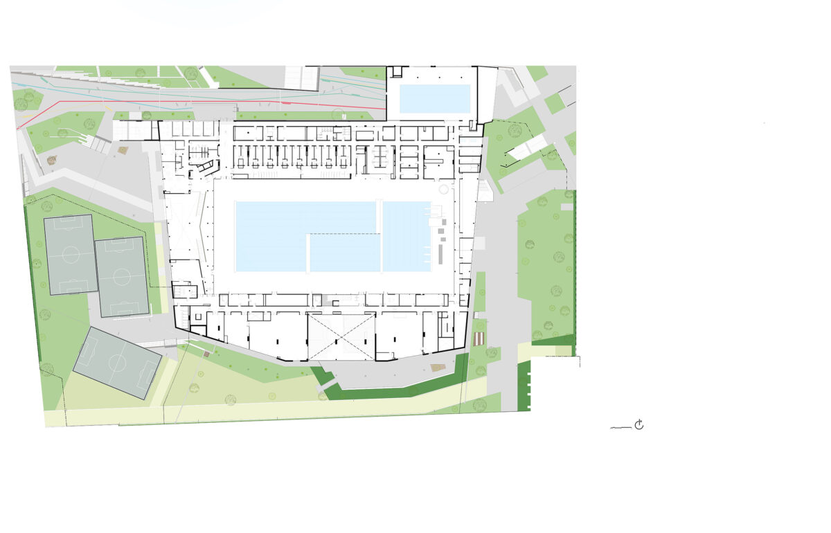 Nature was the main inspiration for the design concept. Nature is continuously evolving and adapting to changing circumstances, resulting in harmonious and balanced ecosystems. The Aquatics Centre invites nature itself in the heart of the new ‘city-district-in-the-making’ of Saint-Denis. This very compact proposal creates room for one hundred trees that will be planted to improve the quality of life and air, stimulate biodiversity and create new ecological connections.