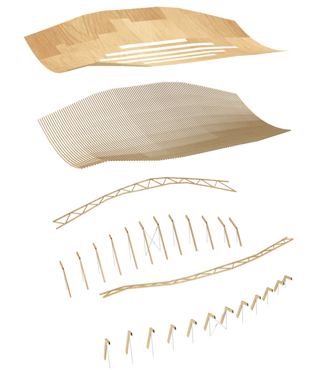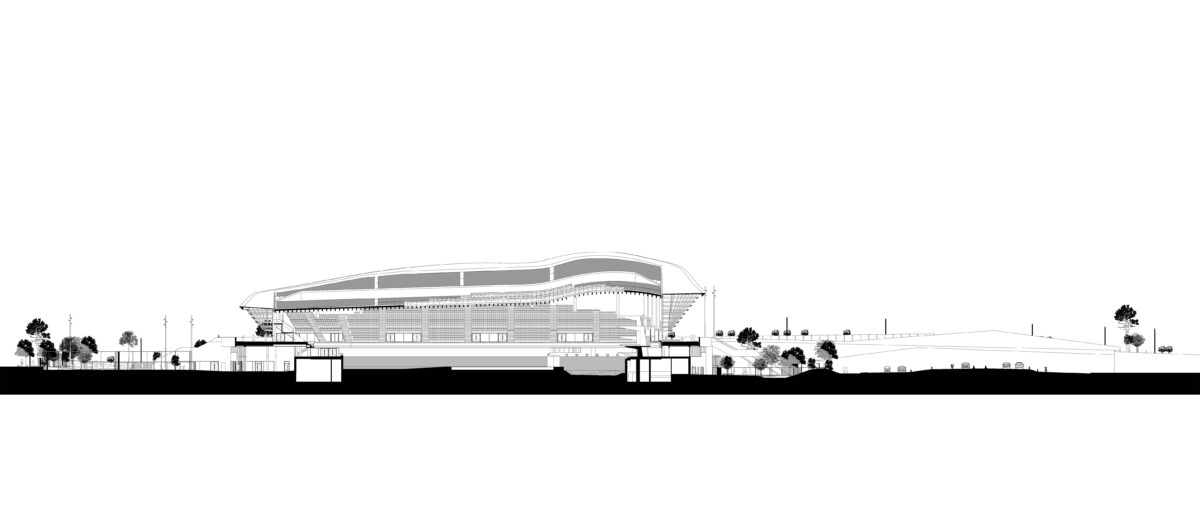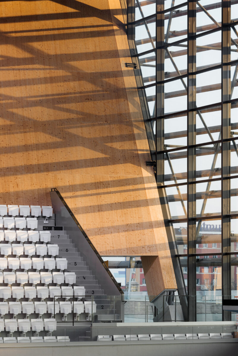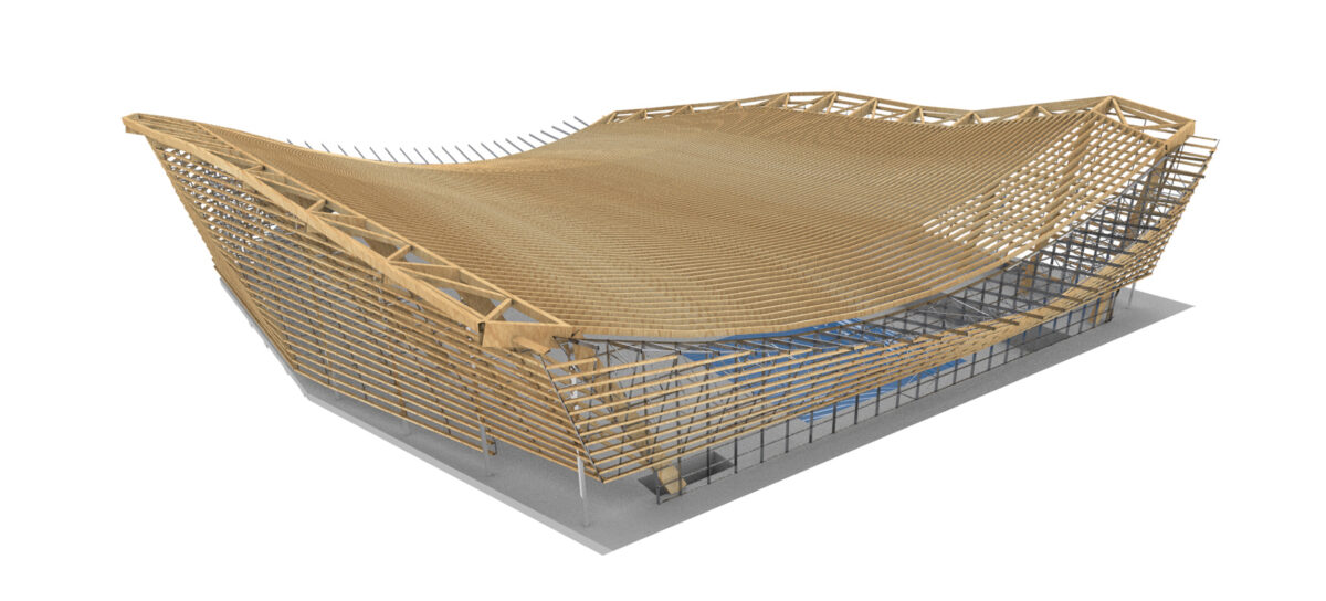 Wood, one of the quintessential bio-based construction materials, is used to create the main structure of this building. The design of the Aquatics centre features an impressive wooden roof, a suspended shape with minimal construction height that strictly follows the required minimum space for tribunes, people and sightlines, thereby minimizing the amount of air that needs to be conditioned during the coming 50 years. By using wood for this monumental structure, the proposal doubles the required minimum percentage of bio-sourced materials. The Olympic arena under the roof, with tribunes on three sides, can host 5000 spectators around an innovative, modular and multifunctional competition pool.