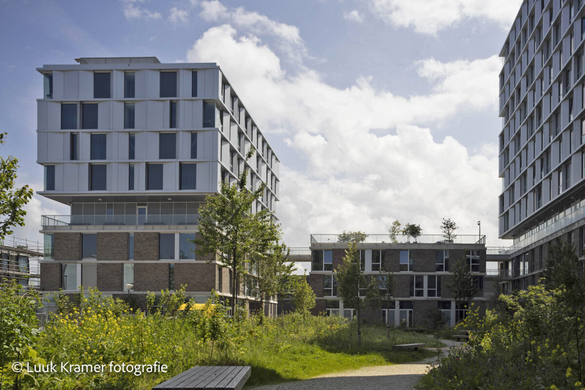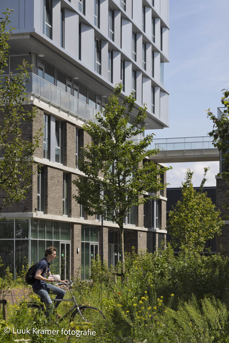 Thermal comfort and general habitat-related wellbeing depend a great deal on how much daylight, fresh air and space we have access to, so our design prioritises daylight admission, air quality via year-round natural ventilation and heat recovery in winter, and underfloor heating. The campus will be largely car-free, and homes close to the busy Plesmanlaan will come with sound-absorbing facades. Finally, buildings will be oriented in a way that creates microclimates beneficial to the wellbeing of not only people, but also flora and fauna.