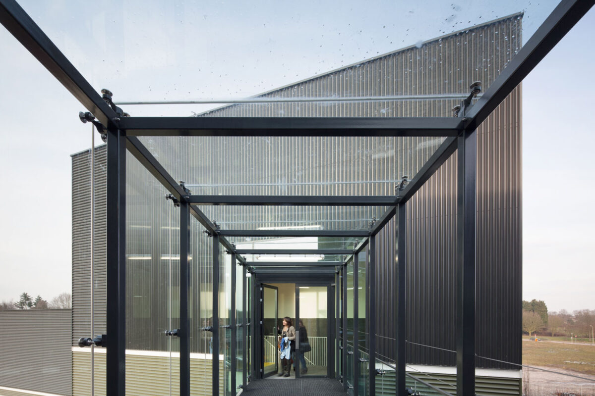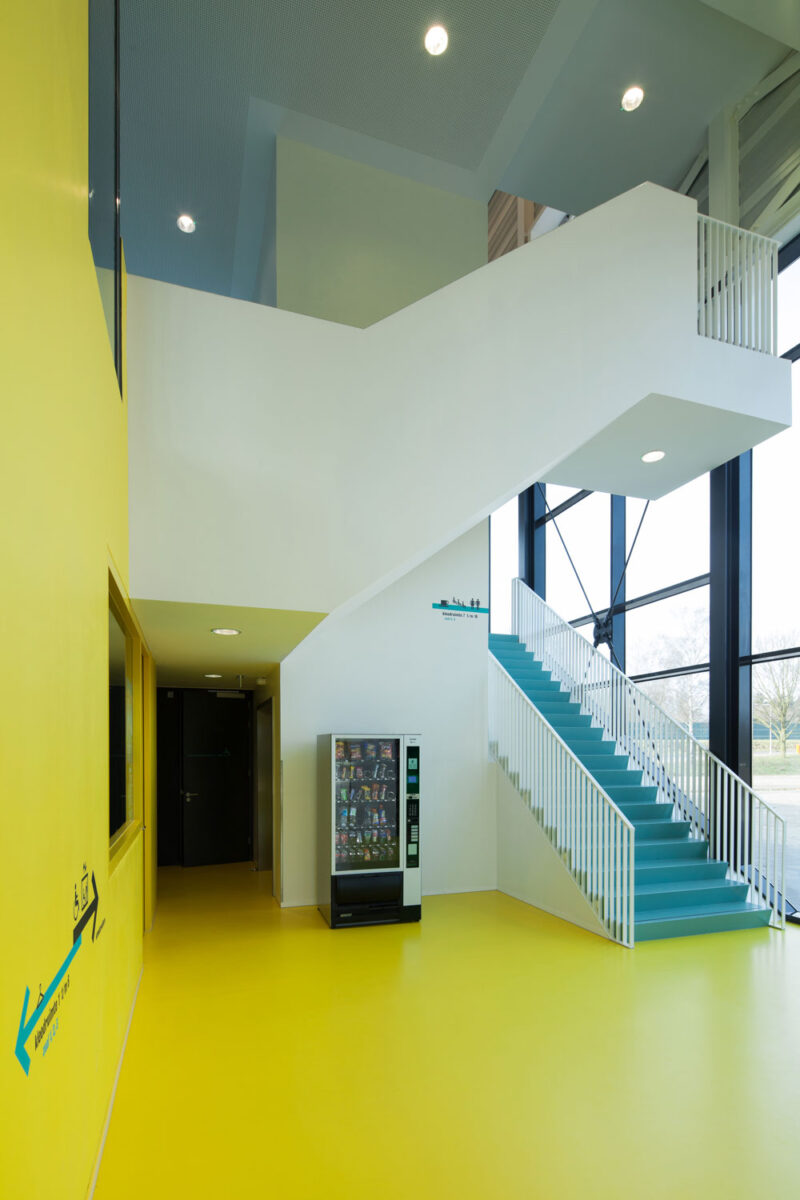 The building is connected to the college by means of a pedestrian bridge. This creates an access point for college use on the upper floor in addition to the main entrance on the ground floor, and allows for optimal use of the facility by different groups simultaneously.