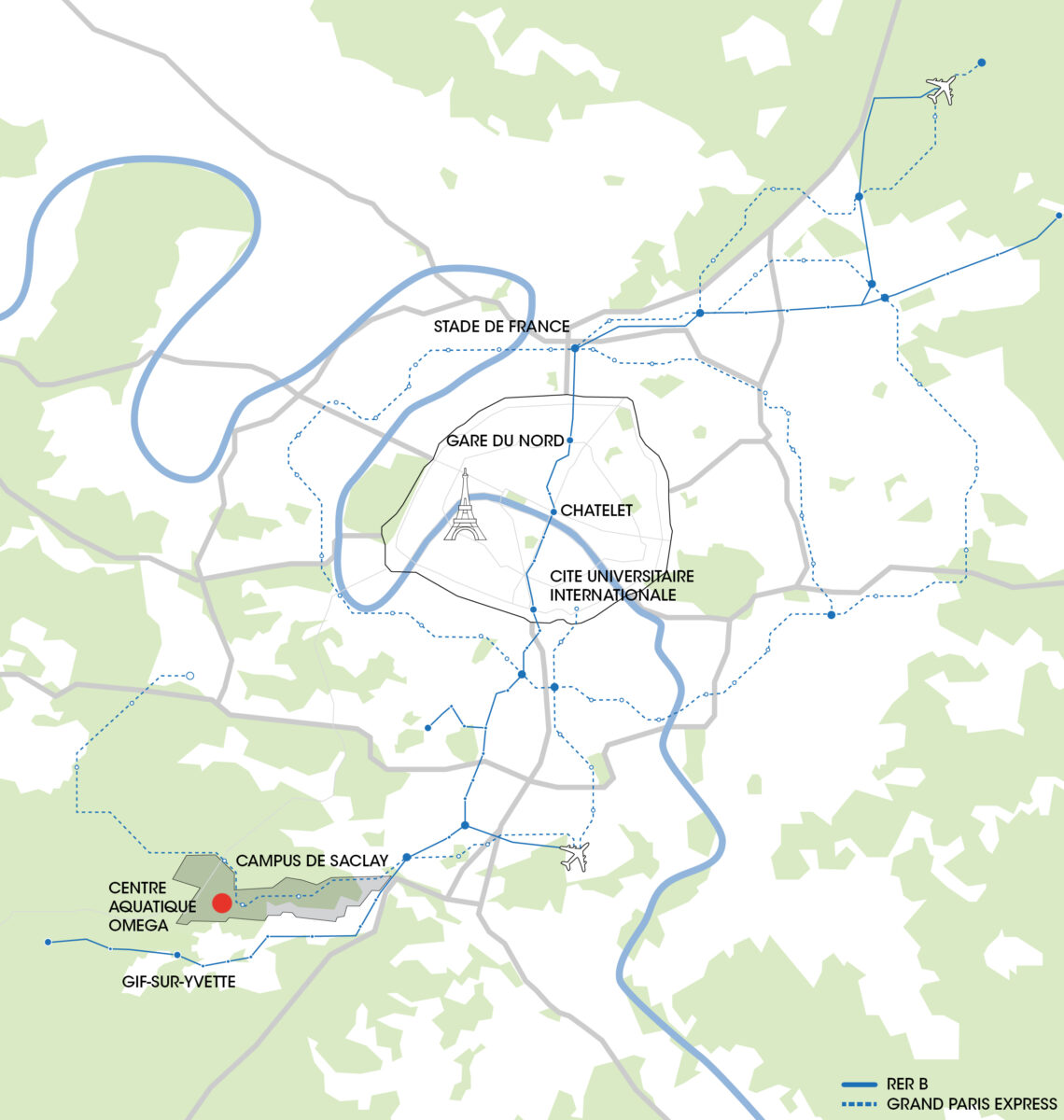The aquatic and fitness center OMEGA is part of the Plaine des Sports in the Moulon district, serving as the western gateway to the Paris-Saclay urban campus. Connected to the metropolitan area of Paris via the future Grand Paris Express, it is situated within a unique scientific, historical, and economic hub. As Paris-Saclay aspires to become a world-class innovation ecosystem, OMEGA plays a key role in this vision. Envisioned as being more than a sports facility, OMEGA is designed as a social hub where people meet and connect through sports, strengthening the social bond between campus residents and the local communities of Gif-sur-Yvette.