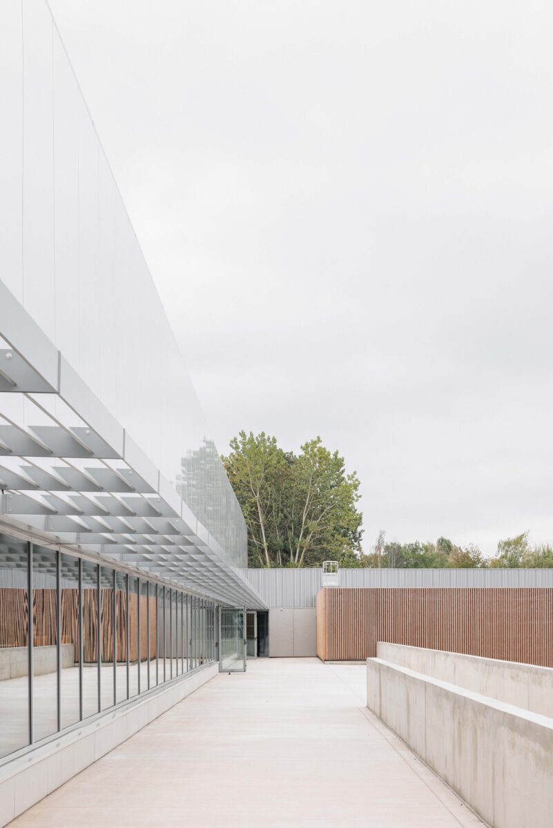 Compact building designs and limited impermeable surfaces preserve green spaces, creating areas for relaxation with attention to local biodiversity. Landscaped ditches border the site. These provide shelter from wind and create an intimate green solarium with views of the surrounding agricultural plateau and wooded hills. The planting design, inspired by local flora, provides a year-round display of colors and textures, visible from both the swimming pools and solariums. The wide-ranging vegetation creates intimate spaces, such as clearings and an orchard, while the horticultural layout fosters the development of biodiversity through sustainable ecological practices.