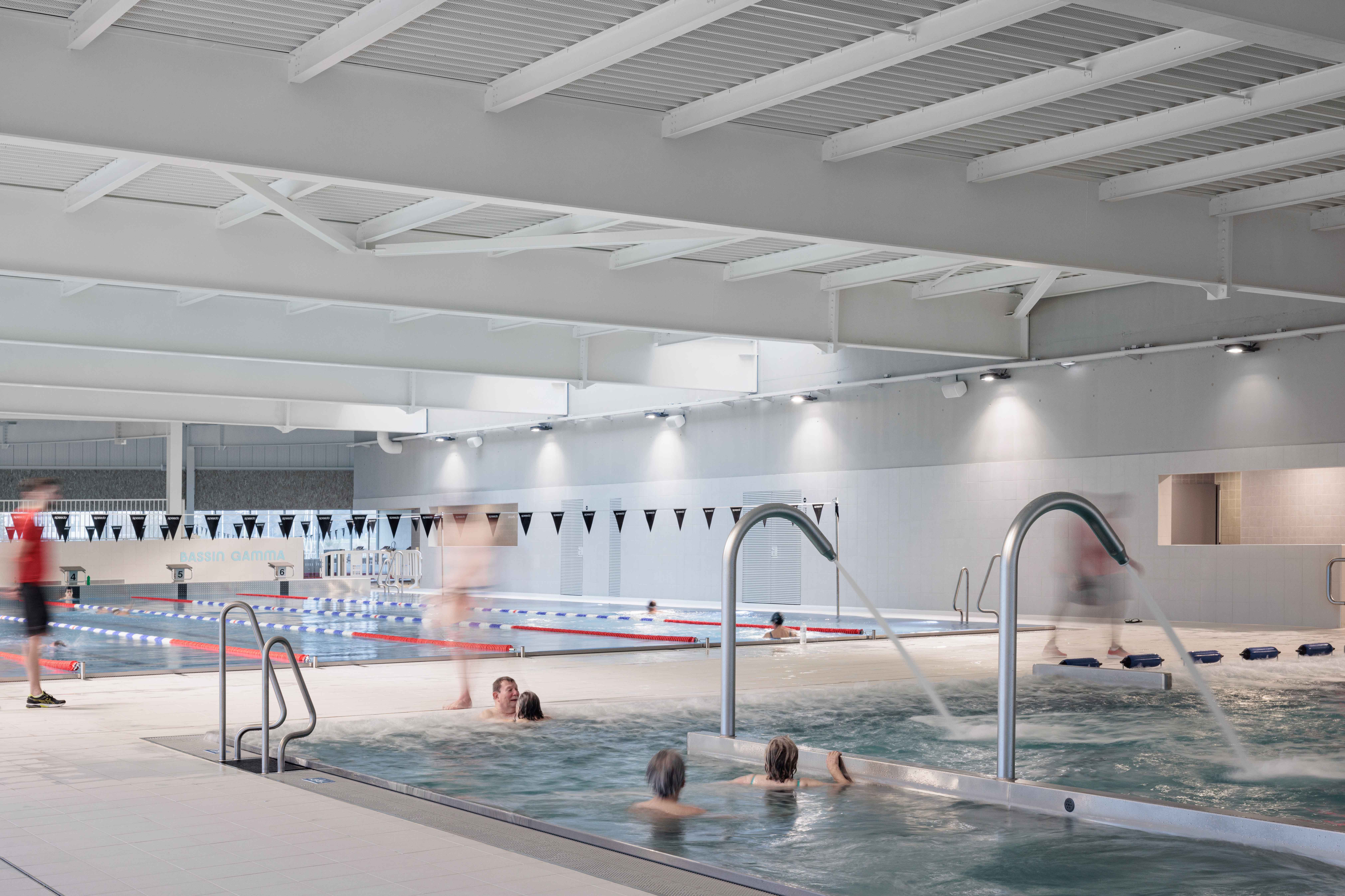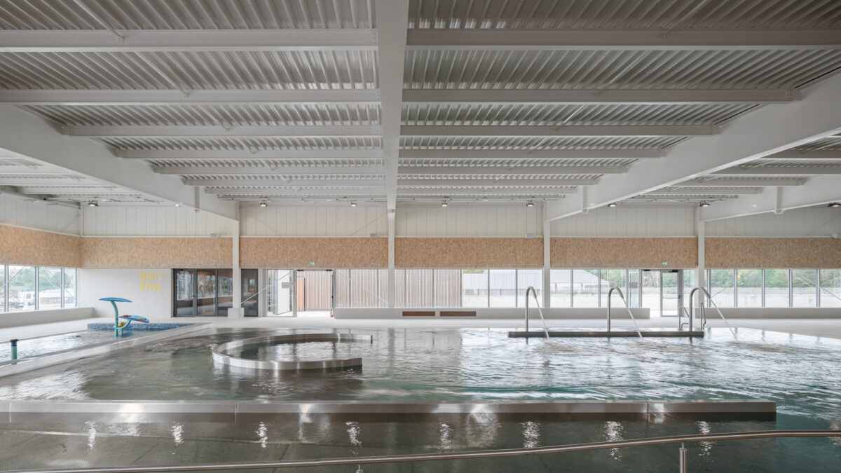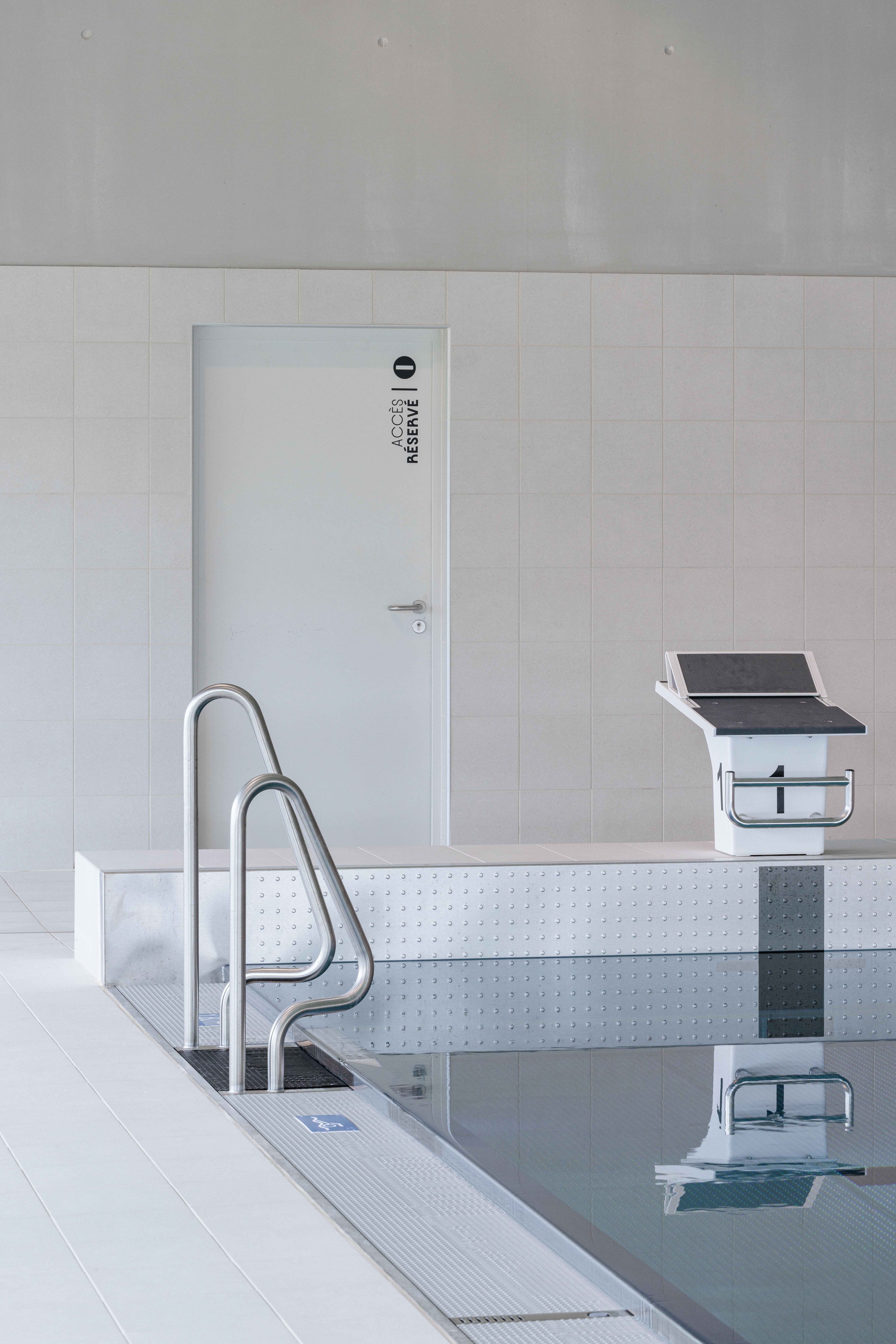 The aquatic hall is divided into three distinct atmospheres: sports, educational, and recreational, creating a harmonious and versatile space. There is a sports pool with bleachers on one side, a multi-purpose pool in the center, and a playful balnéo pool that extends into a paddling area. The hall is fully open to the landscape, providing unobstructed views and allowing natural light to seep in. Benches integrated into the pool decks offer spaces for rest and for placing items dry. With a simple and clear volume, attention is immediately drawn to the water in the pools. This appears a magical blue due to the pure stainless steel finish of the pool walls, enhancing the attraction and magic of the place.
