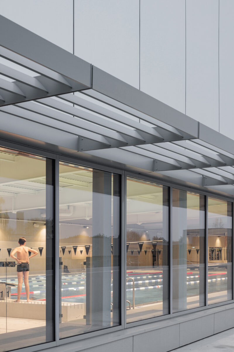 The design invites visitors in, guiding them naturally from the forecourt to the bathing areas. Transparent, horizontal forms maximize natural lighting and create a visual connection between the pools and the surrounding landscape. The ribbed mineral base elevates the reception area while maintaining privacy for users.