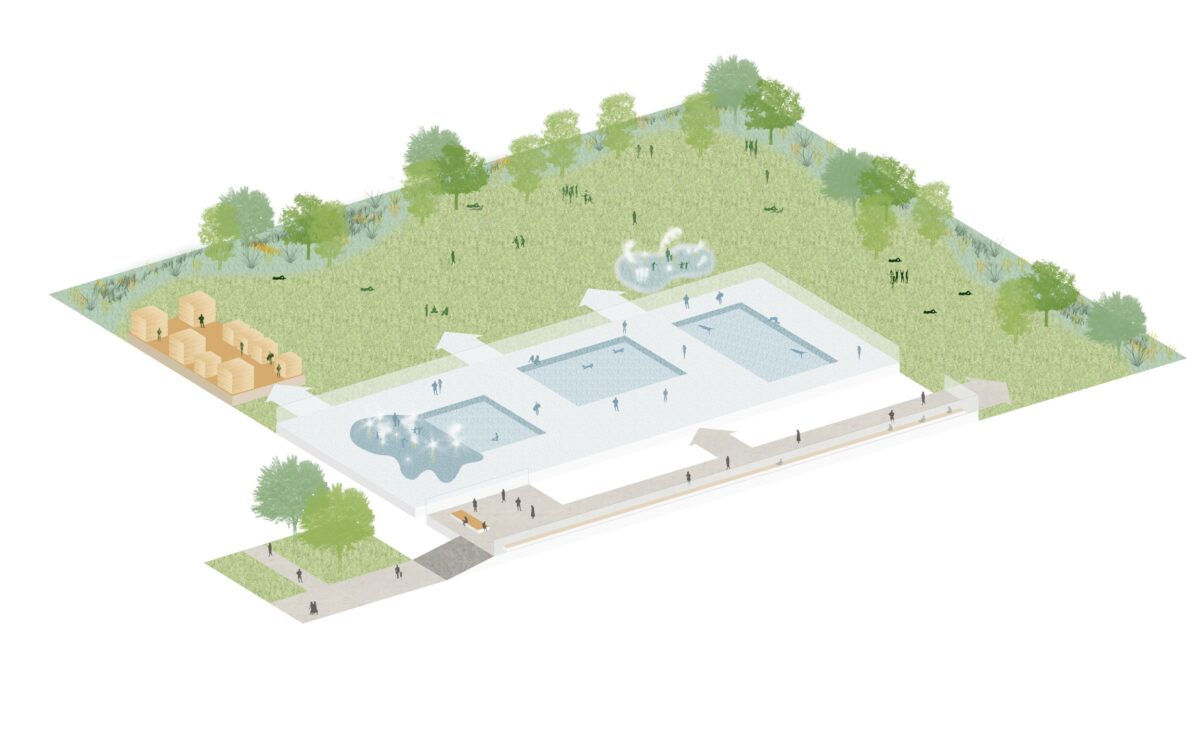| Program: | Competition pool (25x16m), instruction pool (25x16m), recreation pool 250m², toddler pool 45m², fitness area 600m², indoor wellness (2 hammams, sauna, 3 experience showers, scrub room, Scandinavian shower, ice fountain, luminotherapy room), outdoor wellness (sauna pool, sauna, cold pool, salt cave, ice cave, zen terrace), sunbathing lawn 7,500m² with a water play zone of 200m². |
