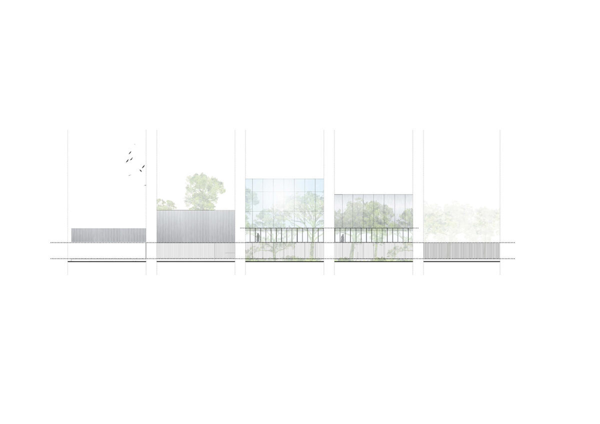 Each architectural element of the place has a clearly defined materiality: concrete bases, metal volumes, and wooden accents. Our strategy is to create a variety of textures and finishes while homogenizing colors. The natural colors of the materials are intended to reflect nature’s colors: green for the landscape and blue for the water.