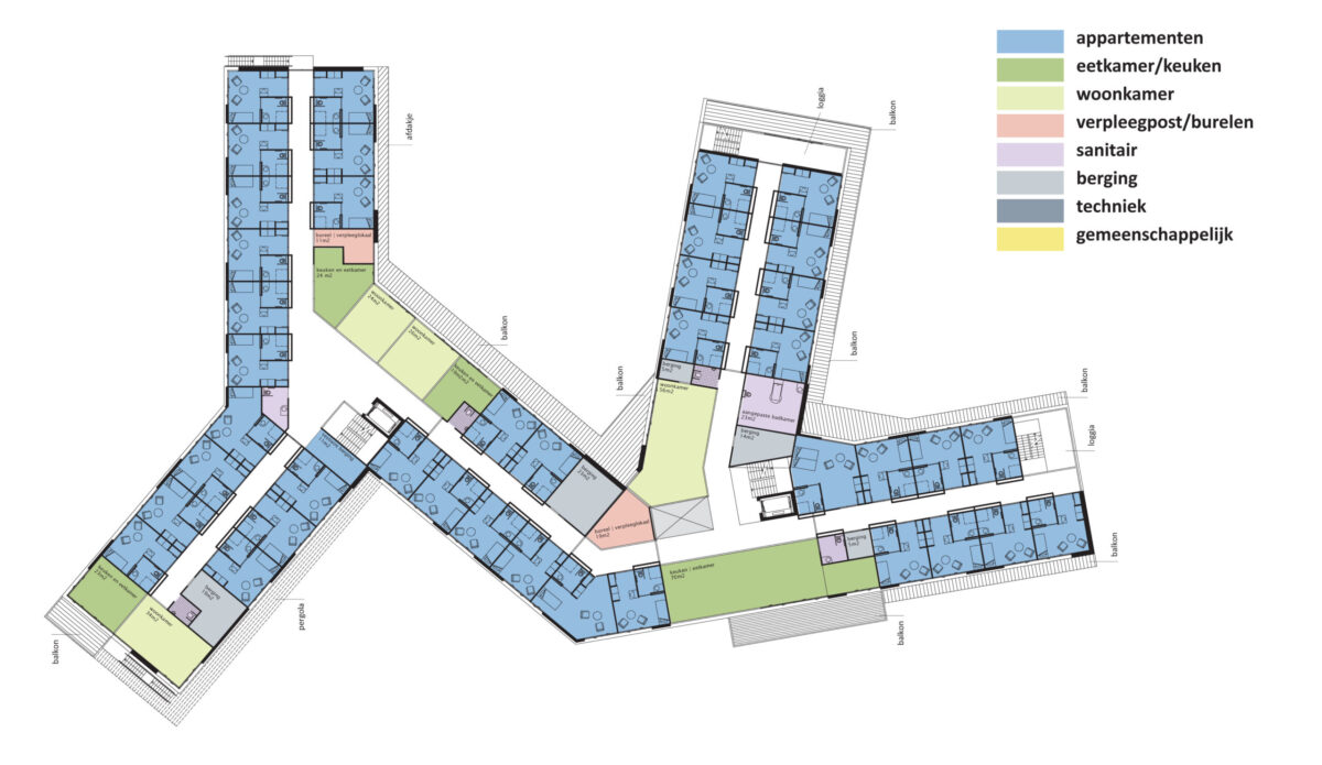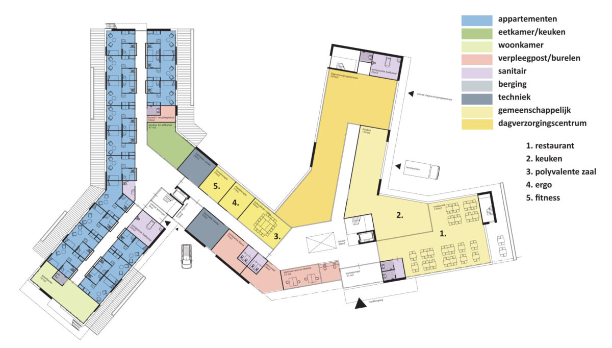 Sterrewijzer nursing home is a small complex in the village of Olen (BE), surrounded by a green environment. Sterrewijzer is a protected environment for individuals, but at the same time it’s a challenging world with different learning stimuli. There is tiered? security, which allows the residents in their home to decide their own interior atmosphere, whilst outside the room there is significant opportunity to meet and undertake activities. There are 69 residential units consisting of small-scale living , protected living and short stay facilities. There is also a day care centre. Due to the flexible building structure and clustered living rooms and kitchen diners (linkable), the staff are very efficient to deploy.
