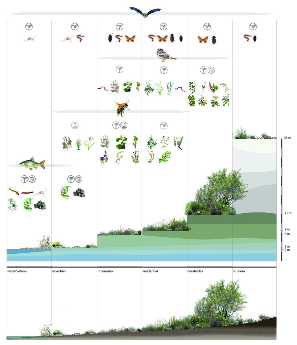 ZOË Amsterdam’s biodiverse design is consistent with the environmental characteristics of the neighbourhood. From underwater and garden spaces to a solar-paneled roof, the building’s multi-level design creates multiple new spaces where flora and fauna can co-exist. Each landscape differs in height and surface, creating variation in the building’s vegetation and in turn the animals that feed, reproduce and shelter there.